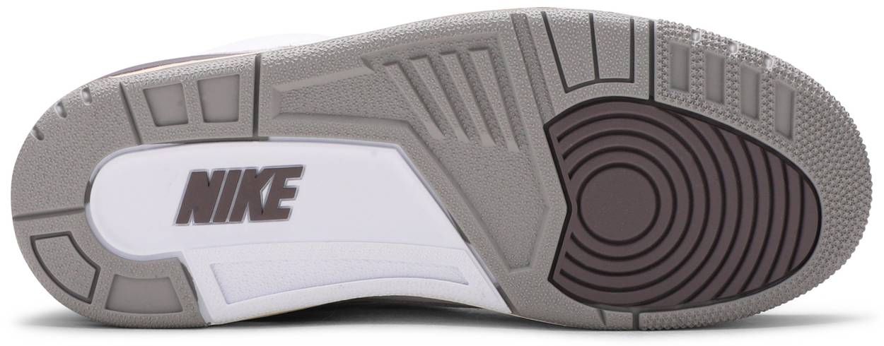 The A Ma Maniére x women's Air Jordan 3 Retro SP ‘Raised By Women’ treats the iconic silhouette to a premium makeover. The Atlanta-based retailer dresses the mid-top in tumbled white leather, overlaid with soft grey suede at the collar, eyestay, heel and toe. Mismatched Jumpman and A Ma Maniére branding is embroidered on each tongue, featuring a quilted lining that’s repeated on the interior collar. A subtle cream hue is applied to the molded heel panel, decorated with an embossed Nike Air logo, and polyurethane midsole. Violet-colored detailing wraps around the heel, providing a contrasting pop of color.