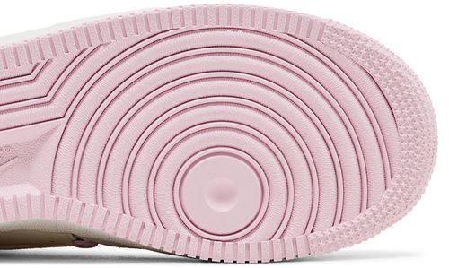 The Nike Women's Air Force 1 Low 'Valentine's Day 2025' employs a Sail-colored leather upper with tonal suede overlays at the forefoot and heel. A quartet of molded pink hearts adorn the quarter panel, while the back tab features crocheted detailing around a pink heart marked with an embroidered mini-Swoosh. A graphic on the tongue tag and insole displays Nike branding inside a heart-shaped cherry. The sneaker rests on an off-white rubber midsole, supported underfoot by a pastel pink outsole.