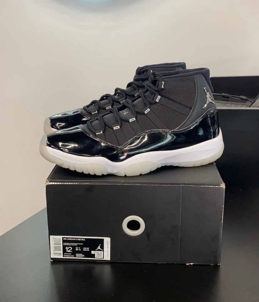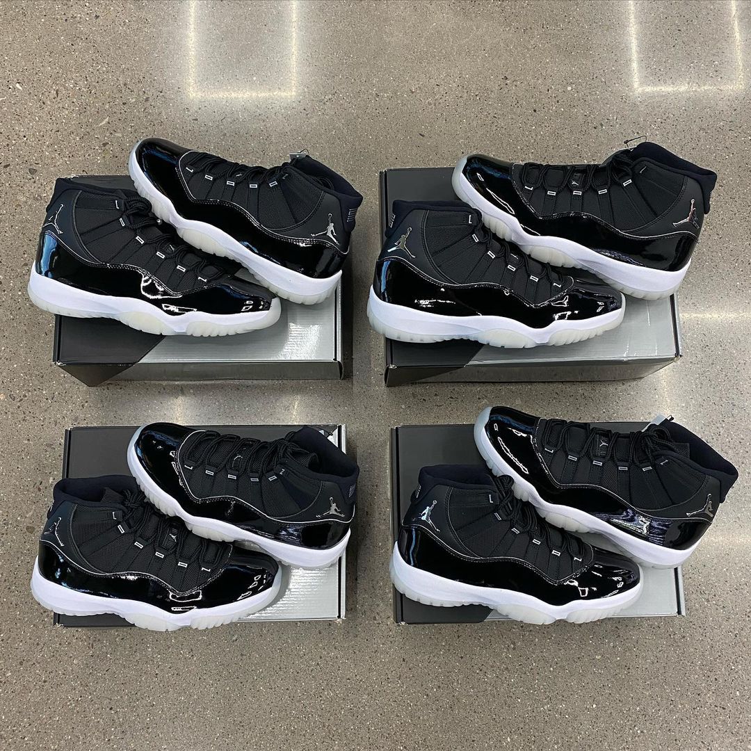 The Air Jordan 11 ‘Jubilee’, also known as the Air Jordan 11 '25th Anniversary', celebrates the classic silhouette’s quarter-century birthday with a monochrome black finish throughout the upper, constructed from a traditional blend of ballistic mesh and patent leather. In keeping with the shoe’s silver anniversary, a 3D metallic Jumpman and matching ‘23’ branding decorate the heel, while ‘Jordan’ is spelled out in stylized silver lettering on each of the sneaker’s eyelets. The mid-top rides on a classic white foam midsole, supported by a translucent rubber outsole.