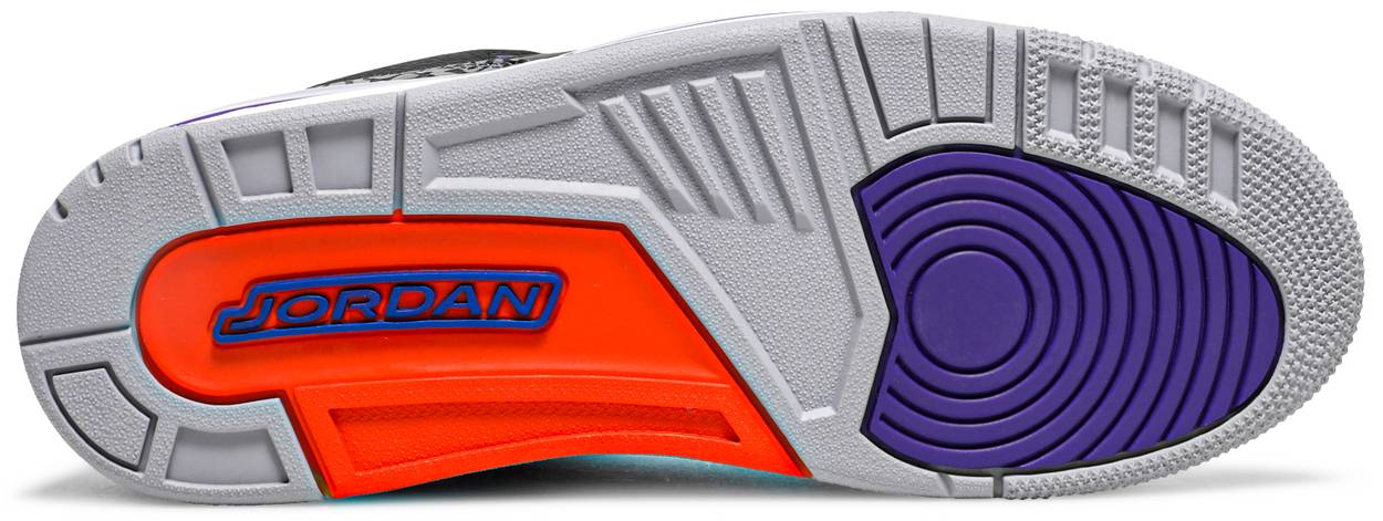 The Air Jordan 3 Retro ‘Court Purple’ makes use of a black tumbled leather upper with signature elephant print overlays at the toe and heel. Violet accents make their way to the padded collar, eyelets and two-tone midsole, featuring visible Air cushioning in the heel. Unexpected pops of vibrant orange stand out on the sneaker’s interior tongue and branding elements, highlighted by a raised Jumpman icon atop the tongue and heel.