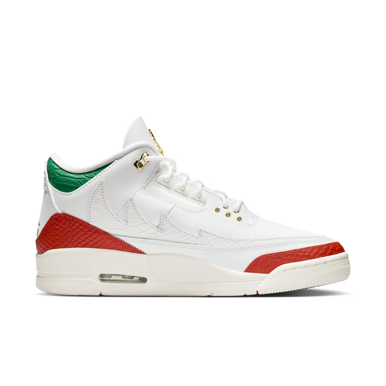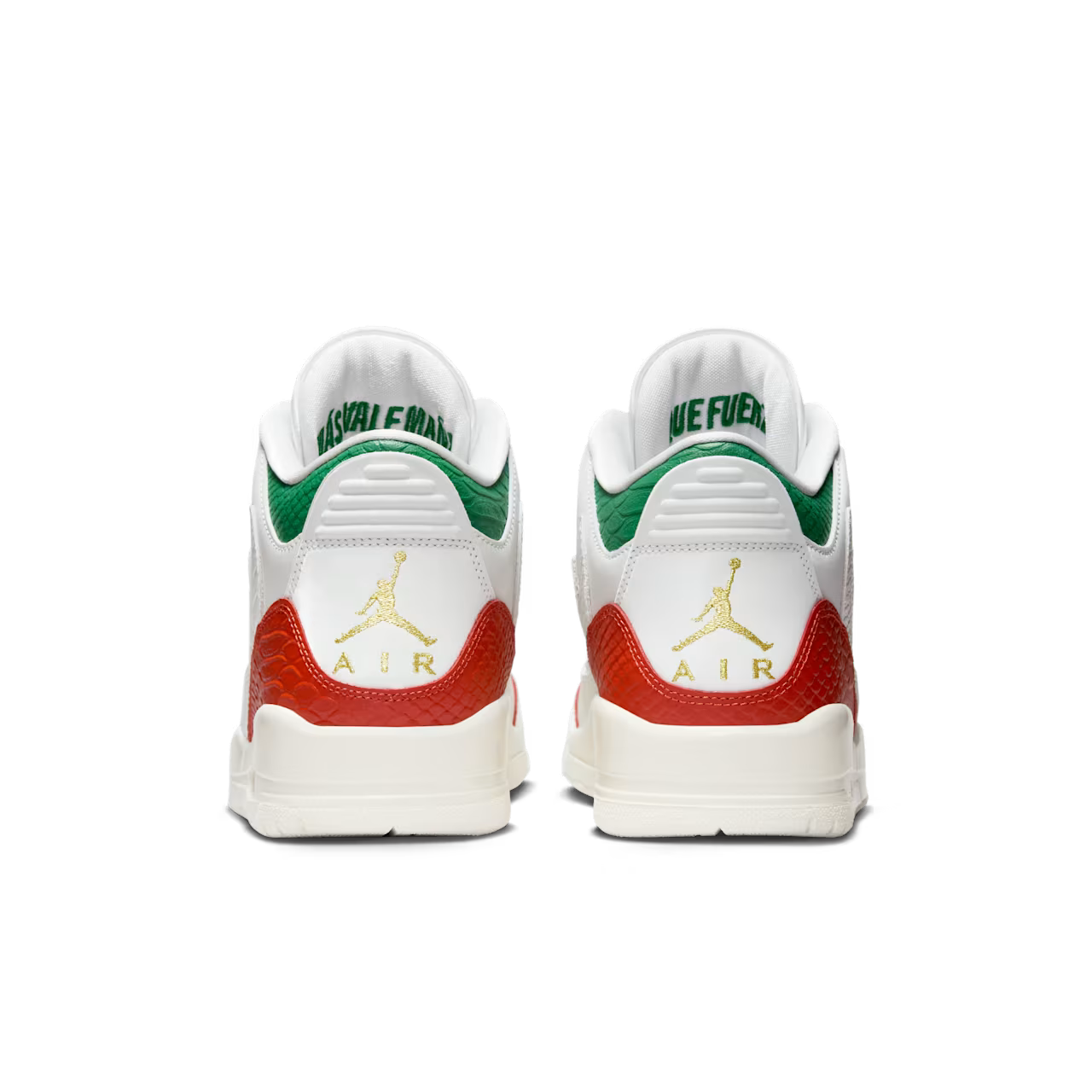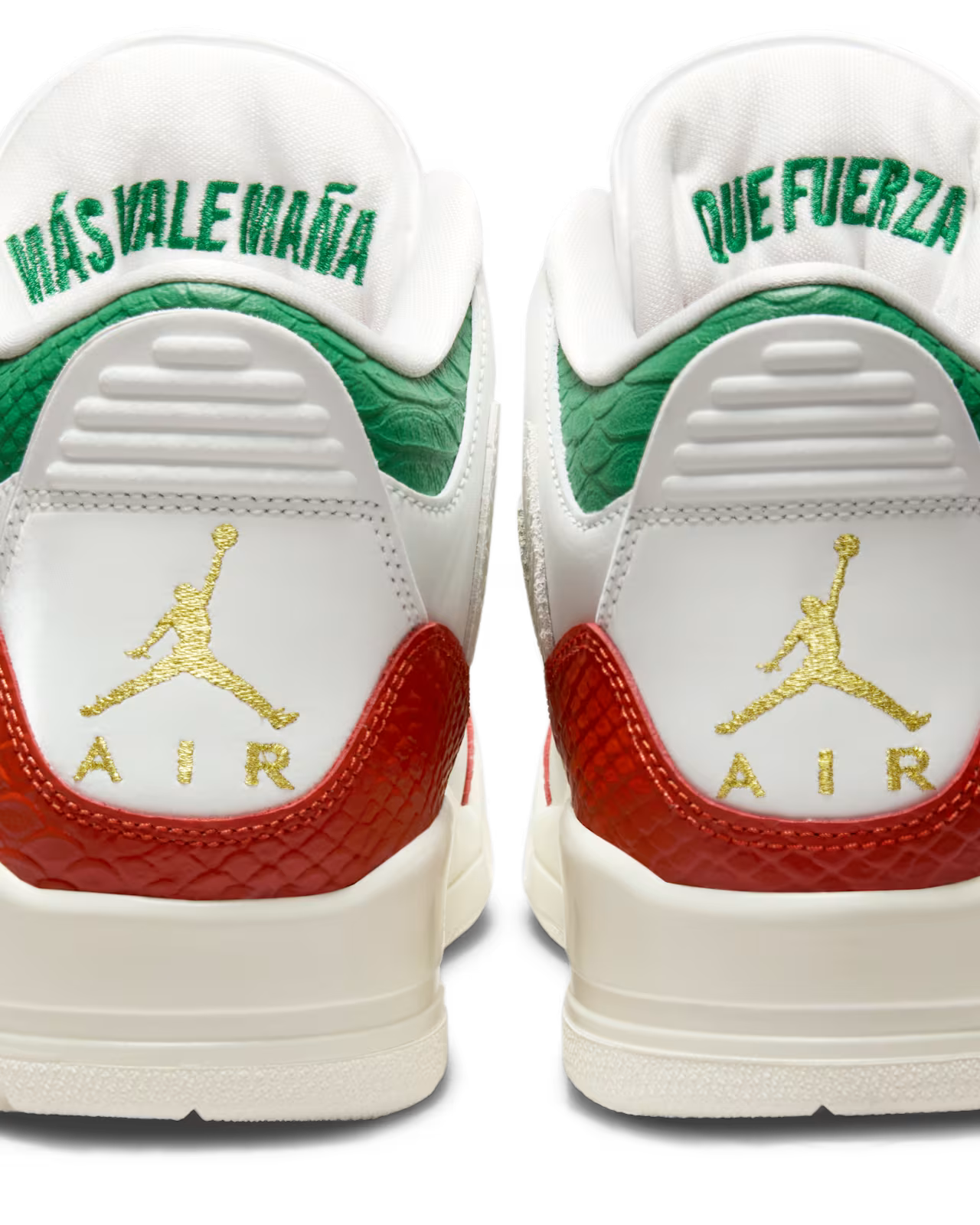 The Air Jordan 3 Retro 'El Vuelo' celebrates Mexican heritage with a colorful design inspired by the country's lucha libre tradition. A smooth white leather upper features a jagged midfoot overlay covered in a scaly texture. The reptilian pattern continues on a padded collar in Pine Green, as well as forefoot and heel overlays in Dragon Red. 'Más vale maña que fuerza' is inscribed on the interior tongue of each shoe, which translates to 'Brains over brawn.'
