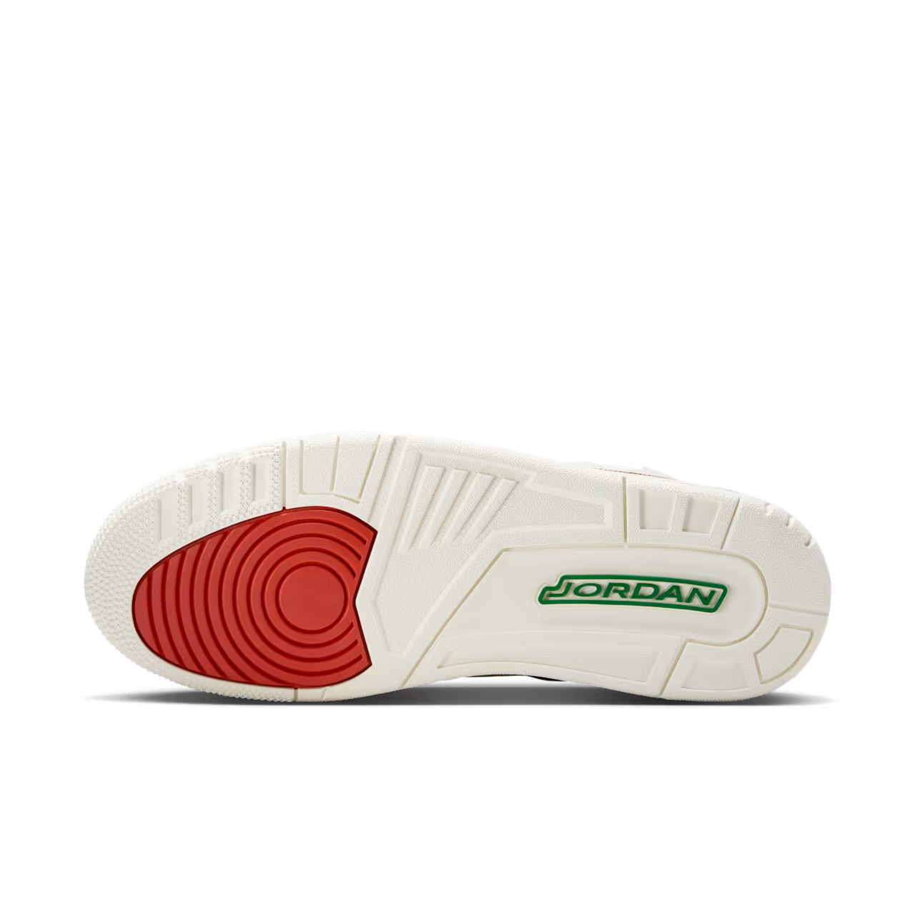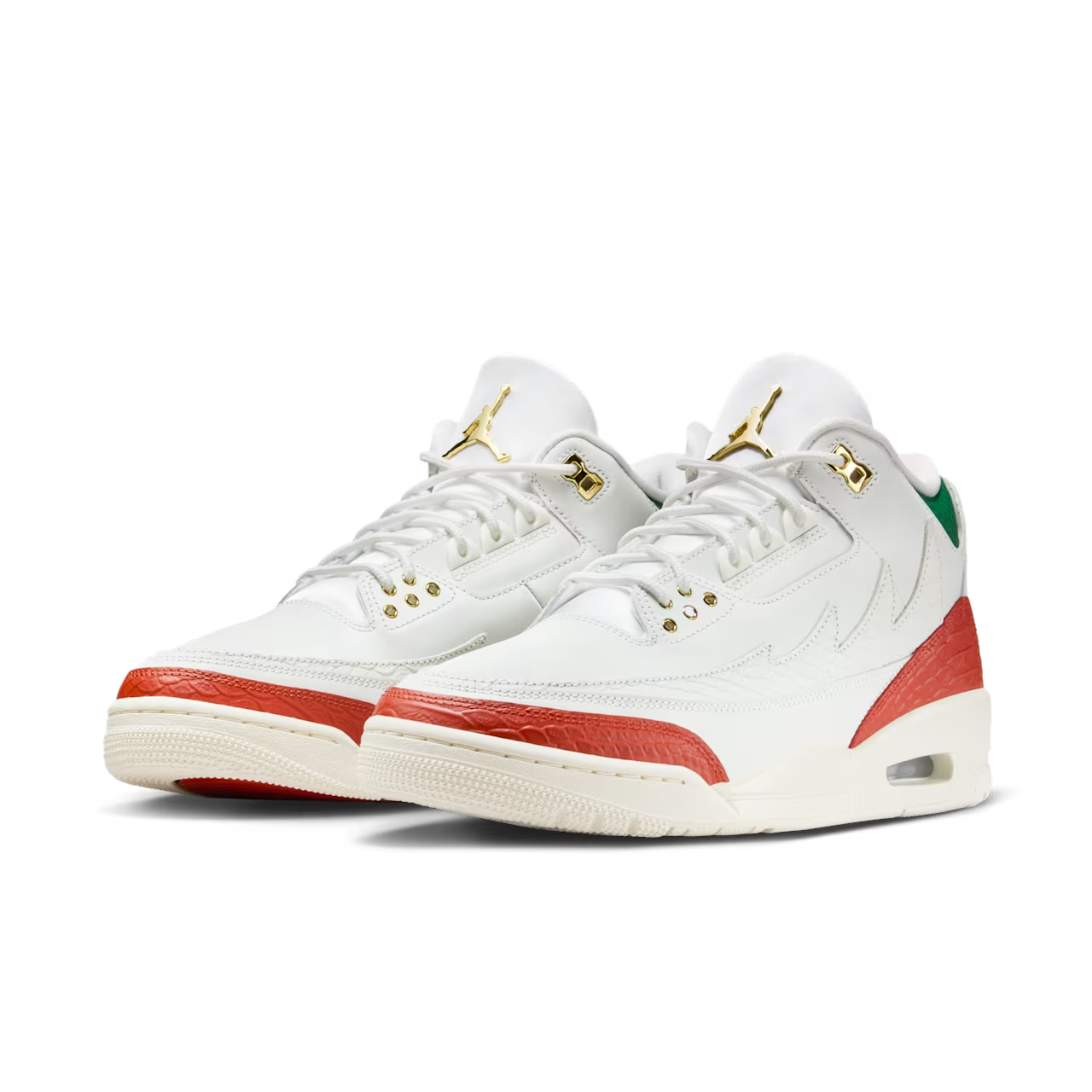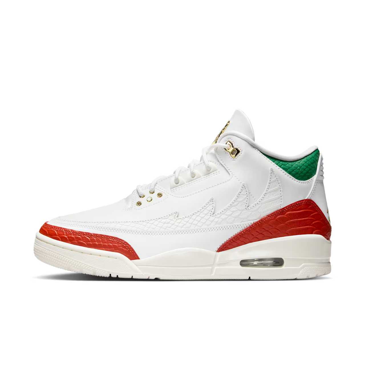 The Air Jordan 3 Retro 'El Vuelo' celebrates Mexican heritage with a colorful design inspired by the country's lucha libre tradition. A smooth white leather upper features a jagged midfoot overlay covered in a scaly texture. The reptilian pattern continues on a padded collar in Pine Green, as well as forefoot and heel overlays in Dragon Red. 'Más vale maña que fuerza' is inscribed on the interior tongue of each shoe, which translates to 'Brains over brawn.'