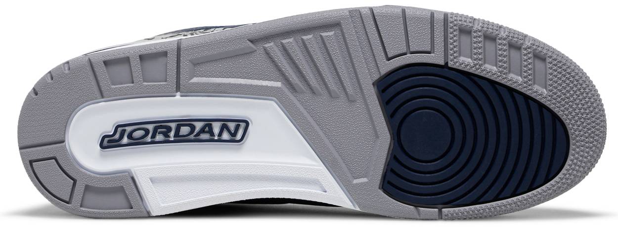 The Air Jordan 3 Retro ‘Georgetown’ is clad in the signature colors of the Hoyas, the team that Michael Jordan victimized on the way to an NCAA national championship. The classic silhouette features a navy tumbled leather upper, reinforced with signature elephant print overlays at the toe and heel. Jumpman branding hits adorn the grey synthetic leather tongue and molded navy heel panel. Lightweight cushioning is provided by a polyurethane midsole enhanced with a visible Nike Air unit under the heel.