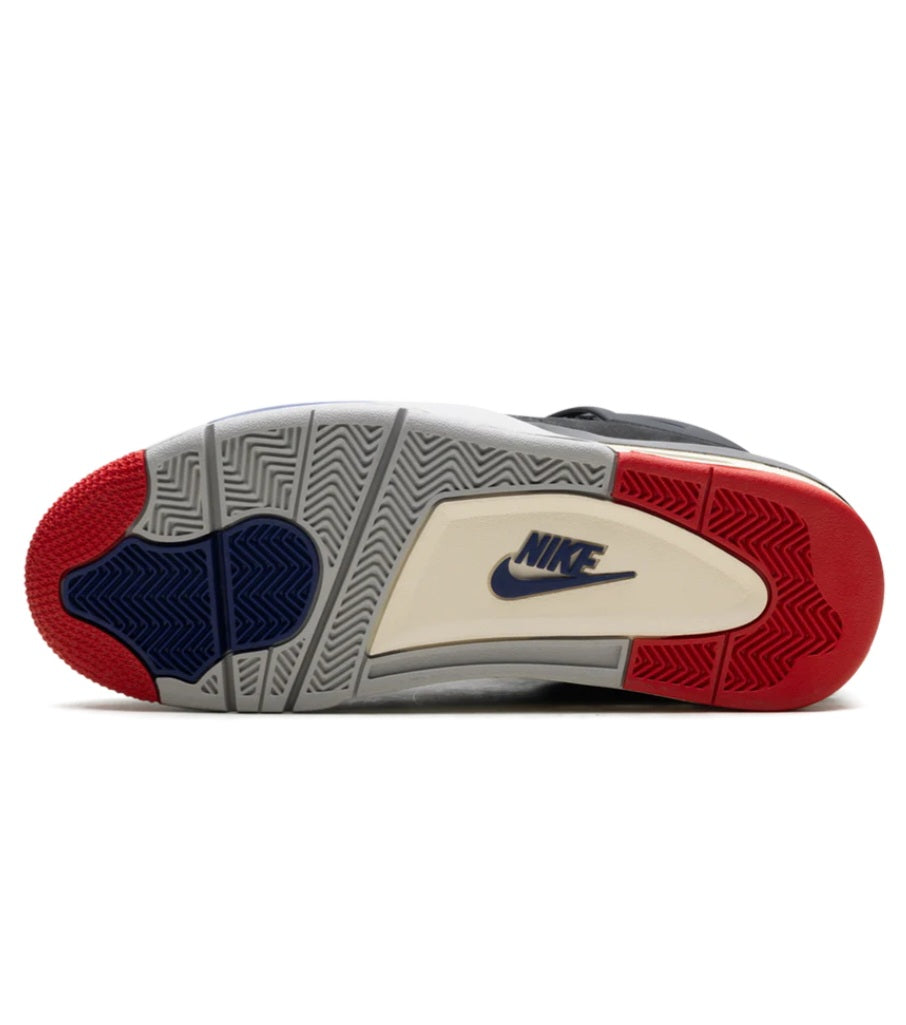 The Air Jordan 4 Retro 'Rare Air - White Lettering' makes use of a black nubuck upper with quarter panel netting, TPU support wings, and molded eyelets in matching black and Fire Red. Outlined in contrast white stitching, a grey suede overlay reinforces the forefoot. The collar is lined in royal blue textile, matching a heel tab marked with Nike Air branding. Interchangeable Velcro patches decorate the tongue, while a 'Rare Air' logo graces the sockliner. Anchoring the sneaker is an Air-assisted polyurethane midsole, featuring a color-popped accent in royal blue and a splash of black around the heel.