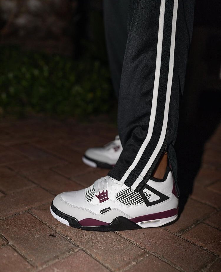 The Air Jordan 4 PSG “Paris Saint Germain” is a desirable collaboration between the European football club and Jordan Brand on Michael Jordan’s fourth signature shoe. Paris Saint Germain, or simply “PSG,” has received special colorways of classic Air Jordans since inking a sponsorship deal with Jordan Brand in 2018. The upper features smooth white leather on the mudguard, which spans from the heel to the toe. Tumbled white leather can be found around the eyelets, collar, and heel. Subtle light grey nubuck detailing is located on the toe. White netting is layered over a black synthetic material on the tongue and mid-panel. Bordeaux accenting comes into play on the plastic lace holders and midsole walls. The burgundy hue can also be found on the underside of the tongue and on the heel. Dual “Paris Saint Germain” and Jumpman detailing dots the heel, while an added "Paname" (another word for Paris) tab is found near the toe.