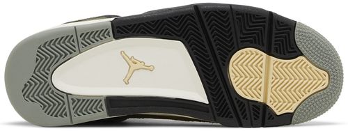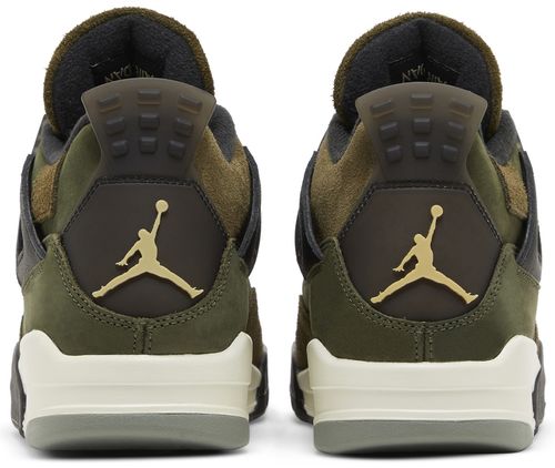 The Air Jordan 4 Retro SE Craft in ‘Olive’ highlights a nubuck and suede upper in varying shades of Medium Olive green. Hairy suede quarter panels feature a debossed grid-like pattern, replacing the traditional midfoot netting of the original AJ4. Contrasting black accents settle on the leather support wings, molded eyelets and woven tongue tag, marked with Flight branding and a cream-hued Jumpman logo. A matching Jumpman icon decorates the back tab. The sneaker sits atop a crisp white polyurethane midsole, enhanced with visible Air-sole cushioning in the heel.