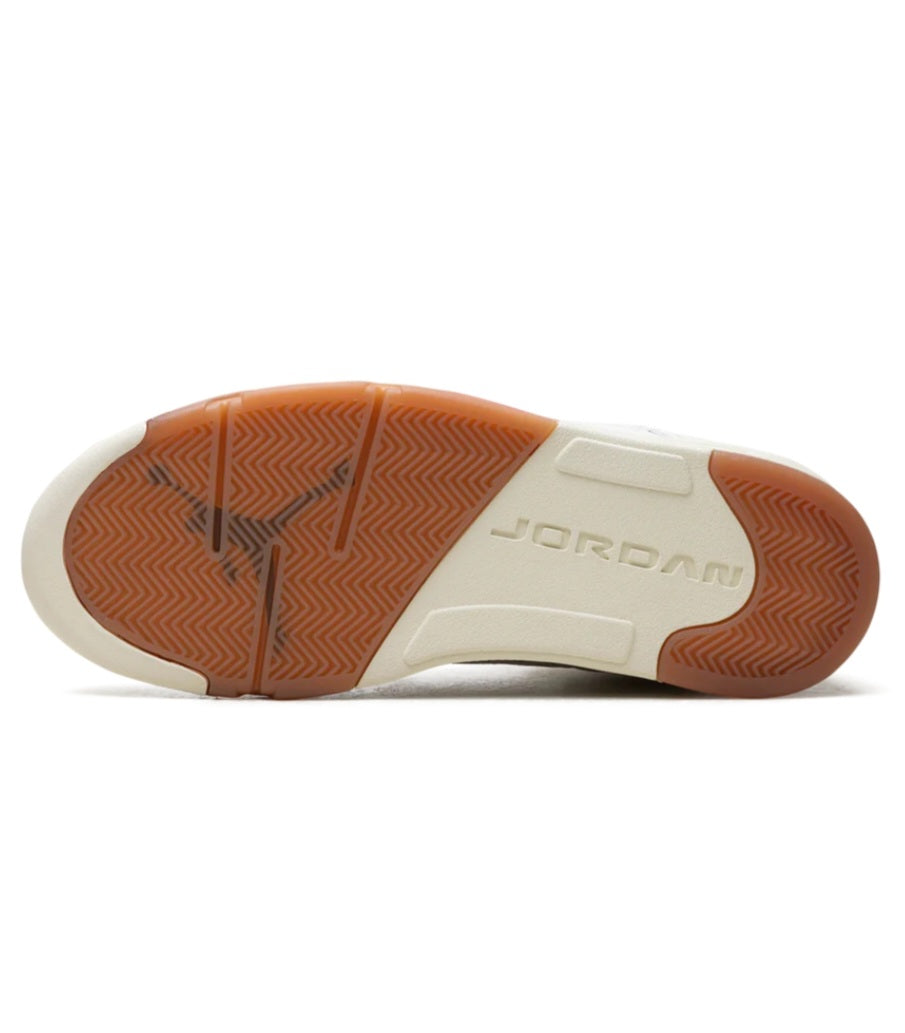 The Air Jordan 5 Retro 'El Grito - Sail' celebrates the culture and heritage of Mexico, with a moniker that alludes to the historic battle cry that sparked the Mexican War of Independence. The legacy silhouette sports an off-white tumbled leather upper with midfoot perforations replacing the traditional TPU netting. Embossed patterns inspired by Mexican architecture adorn the toe, heel and tongue, the latter marked with a Jumpman logo in burgundy embroidery. Built with visible Air-sole cushioning in the heel, the polyurethane midsole features mismatched red and green shark tooth detailing on the left and right shoe, respectively.