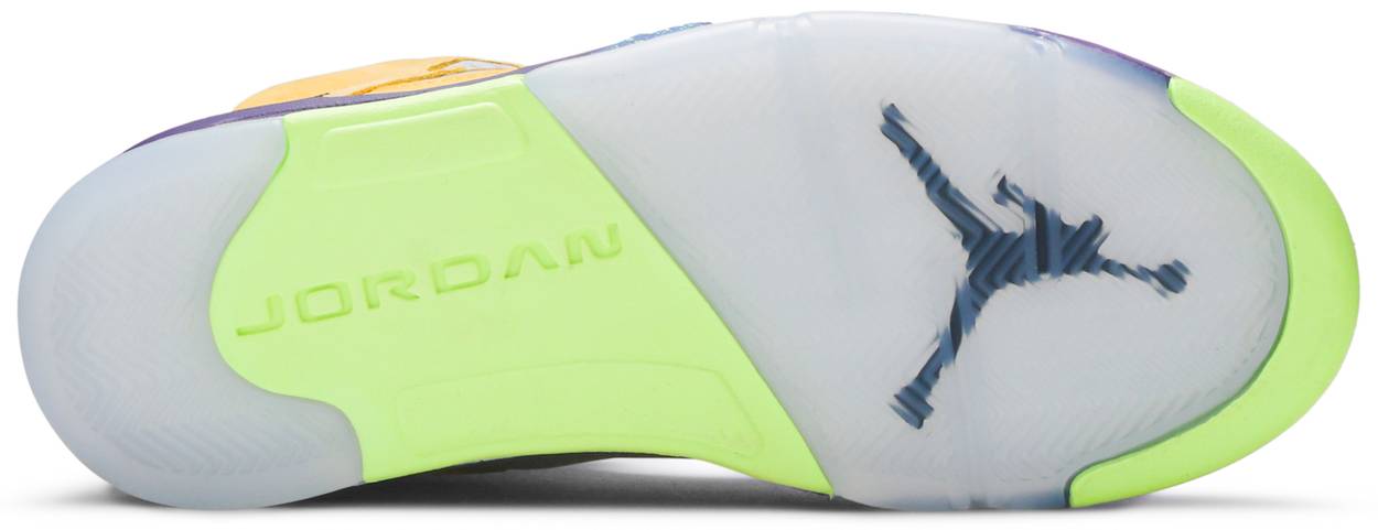 The Air Jordan 5 Retro SE ‘What The’ celebrates the 30th anniversary of the classic silhouette with a mashup design incorporating elements from coveted Air Jordan 5s of years past. Most notably, the right shoe features the yellow suede upper of the ultra-limited ‘Tokyo’ release, complete with stylized ‘23’ on the lateral heel. The left shoe borrows the red suede upper of the ‘Raging Bull’ pack, accented with the ‘Shanghai’ heel emblem. Additional source colorways include the ‘Bel-Air,’ ‘Laser’ and ‘Quai 54’ from 2011.