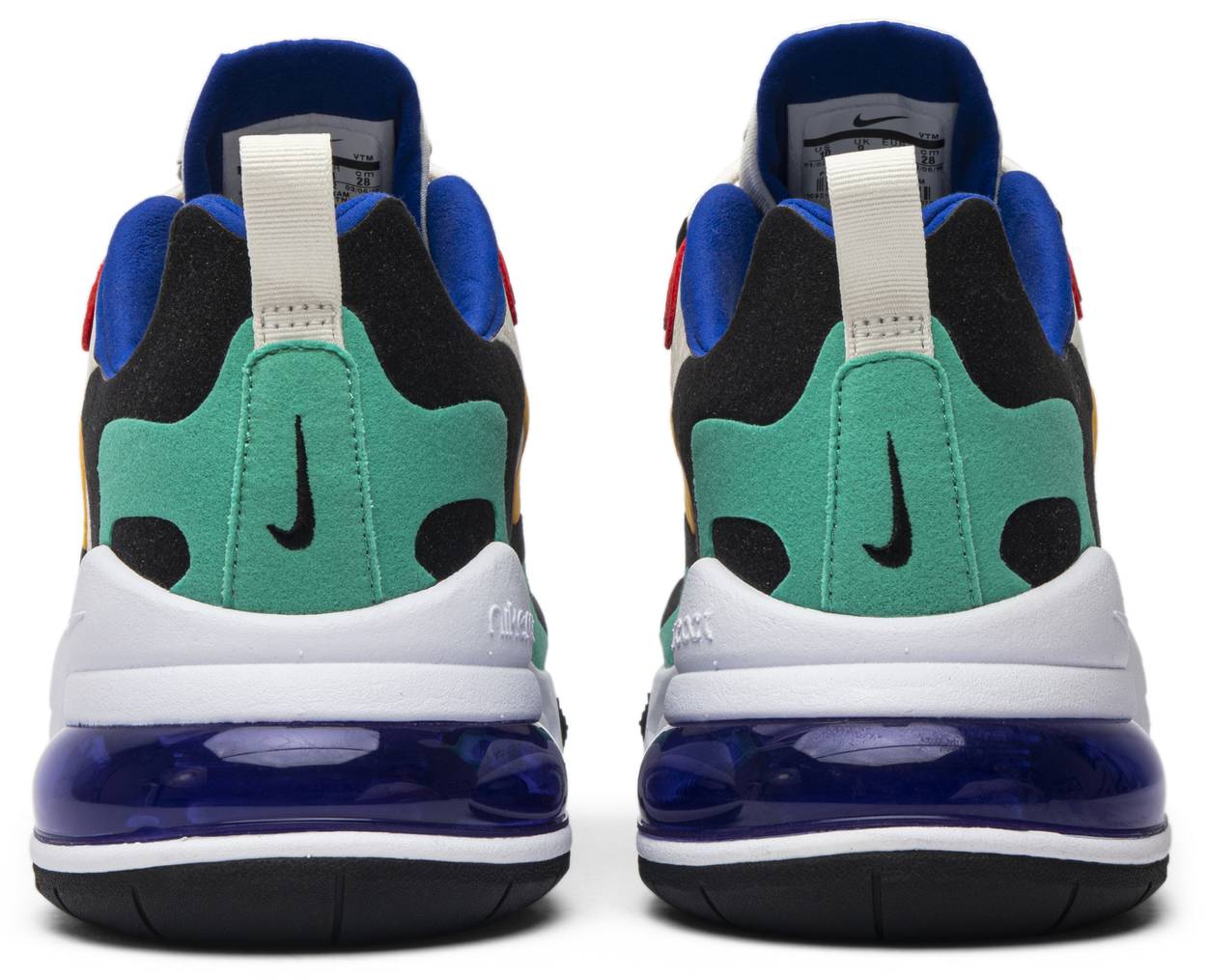 Inspired by some of Nike's most iconic models, the Air Max 270 React debuted just in time for the Women's World Cup in July 2019 on the feet of some of the players. With a white base, the no-sew construction features red, yellow, black and teal suede overlays, paying homage to Bauhaus, the renowned German art school. Revolutionizing the design, Nike fused React foam technology with the massive 270 Max Air unit below, creating a street shoe fit for performance function.