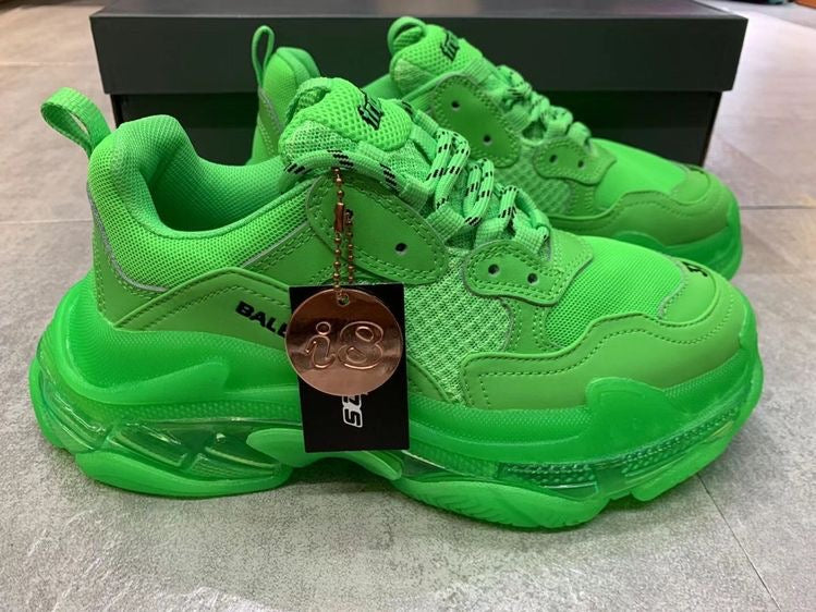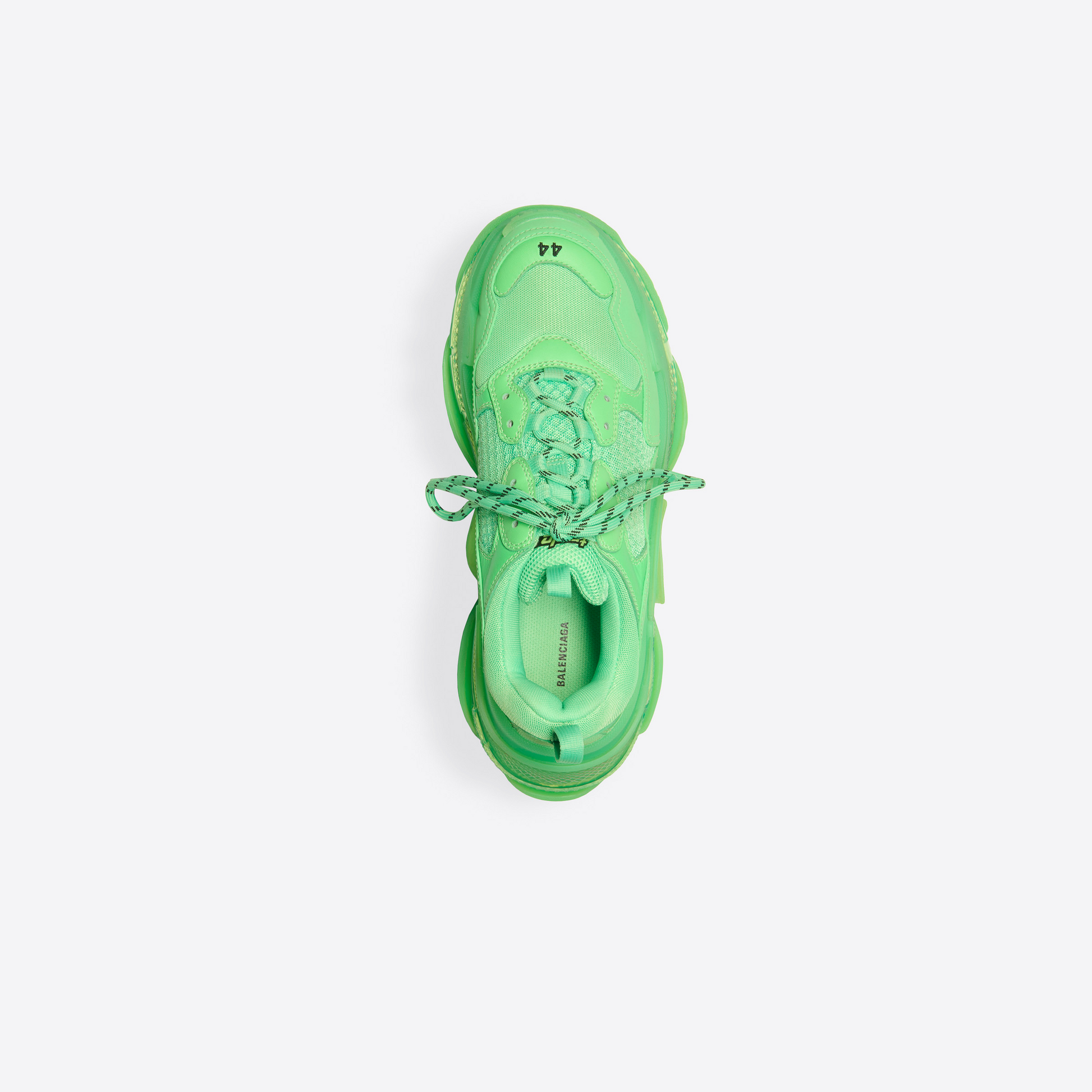 Retail priceRising to cult status in Fall 2017, the Balenciaga Triple S Trainer is a visual composite of three sports: track and field, running and basketball. This 'Neon Green' update—revealed in February 2019—returns the leather and mesh upper with tonal laces, a signature logo to the quarter panel and visible sizing on the toe. Blown out of proportion, the defining three-layered sole amplifies the high-octane hue.