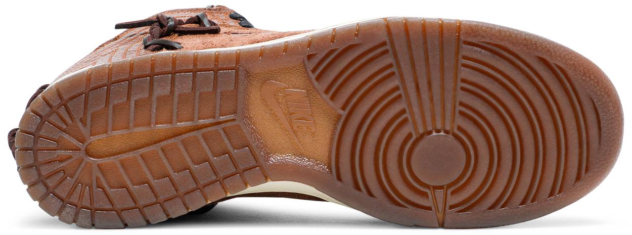 The unique design of the Bodega x Nike Dunk High ‘Legend’ taps into notions of Americana, old-world craftsmanship and the collective spirt of a like-minded team. The Boston-based retailer brings together those influences through detailing that recalls a baseball mitt, highlighted by moccasin-like rawhide stitching on the midfoot, heel and collar. The rest of the upper features a cream-hued leather toe box, brown hairy suede quarter panels and overlays in smooth suede and pebbled leather. A tortoise shell jewel Swoosh adorns the lateral side, while the opposite side features a debossed Bodega logo.