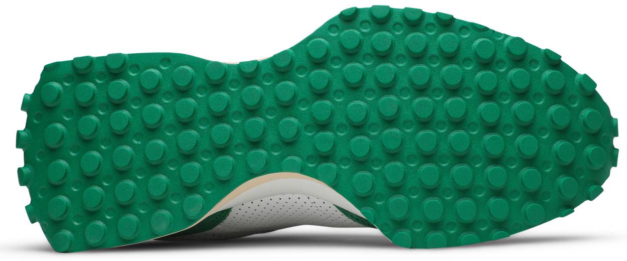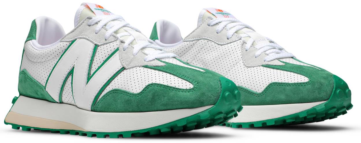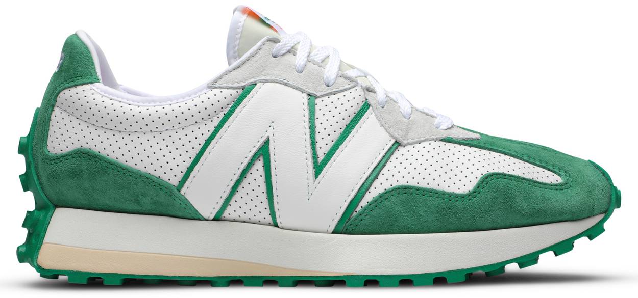 Making its worldwide debut at the French menswear label’s runway show at Paris Fashion Week in January 2020, the Casablanca x New Balance 327 ‘Idealist’ makes use of a new silhouette developed specifically for the collaboration. The build combines a perforated white leather base with green suede overlays and an oversized white leather ‘N’ logo outlined in green. This pair was accompanied by an additional colorway in white and orange.