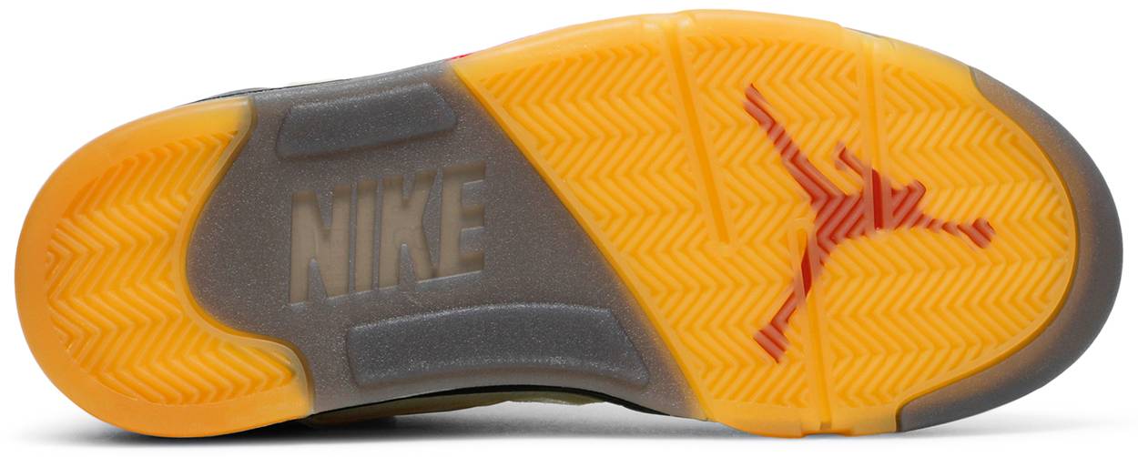 Made in collaboration with Virgil Abloh’s luxury streetwear label, the Off-White x Air Jordan 5 Retro SP 'Sail' represents the follow-up to the partner brands’ black AJ5 from early 2020. This pair makes use of a layered textile upper in a subtle cream finish, complete with circular cutouts on the midfoot, collar and silver reflective tongue. Virgil’s signature flourishes, including printed Helvetica text on the medial side panel, complement ‘23’ and Nike Air branding on the heel. A pre-yellowed translucent outsole adds to the sneaker’s vintage aesthetic.