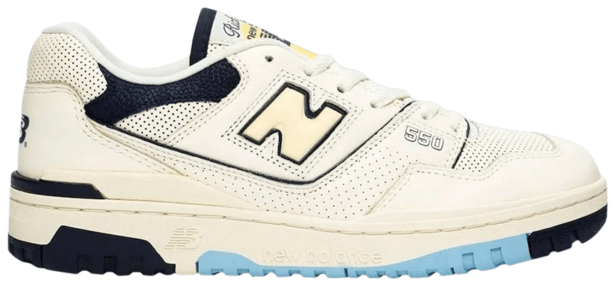 An exclusive colorway made for the high-profile sports agent, the Rich Paul x New Balance 550 showcases a vintage hardwood aesthetic with refreshed details. The upper is constructed from off-white leather with microperforated detailing on the toe box, collar and midfoot overlay. A cream-colored ‘N’ logo outlined in navy adorns the quarter panel, while the woven tongue tag displays ‘Rich Paul for New Balance 550’ branding. Inside the shoe, mismatched insoles feature Rich Paul’s initials on the right shoe and a flying NB logo on the left. The sneaker sits atop an off-white midsole, supported by a rubber outsole in navy and powder blue.