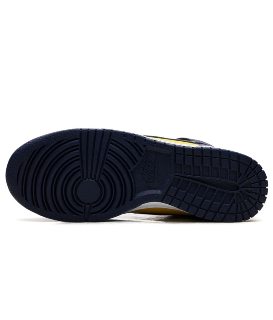 The 2025 edition of the Nike Dunk High 'Michigan' revives one of the original colorways of the vaunted 'Be True to Your School' series from 1985. Paying tribute to the Michigan Wolverines, the high-top sports a two-tone leather upper, featuring a Varsity Maize base with Midnight Navy overlays and a color-matched Swoosh. Details include a padded high-cut collar and a breathable nylon tongue, marked with a woven Nike tongue tag.