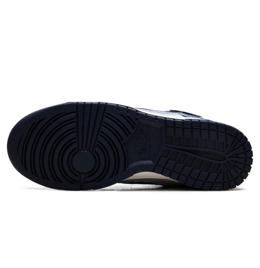The Nike Dunk Low SE 'Light Armory Blue Denim' showcases a two-tone blue denim upper. Frayed edges give the shoe a distressed aesthetic, including the cut-out Swoosh that reveals a blue suede underlay. A woven Nike tag embellishes the breathable nylon tongue, while an embroidered Nike wordmark adorns the denim back tab. A vintage off-white finish is applied to the midsole, supported underfoot by a navy rubber outsole.