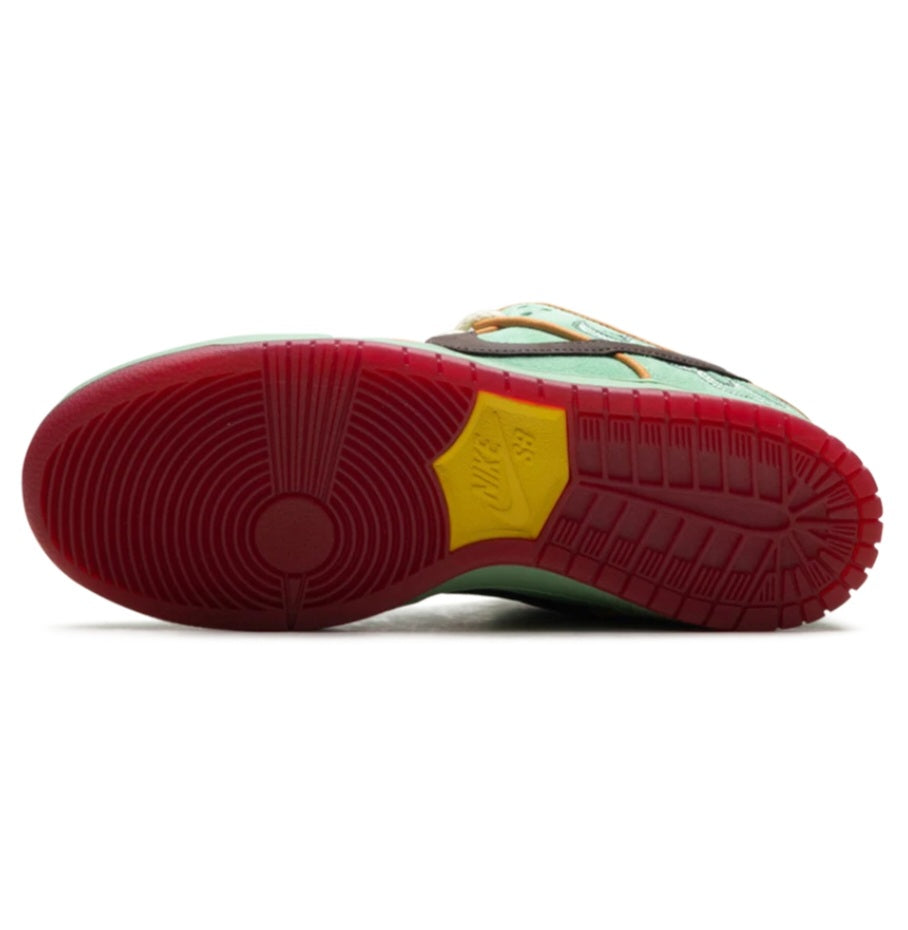 The Dunk Low SB 'Rodeo', also known as 'Tourmaline', showcases a bright green suede upper secured with braided rope laces. A black suede Swoosh graces the side panel, while unique Sonora-style embroidery decorates the heel overlay. Contrasting pops of color arrive via orange piping, a yellow textile lining, and an orange leather back tab marked with crimson Nike branding. Inside the shoe, the sockliner features custom artwork that depicts a cowboy herding cattle.