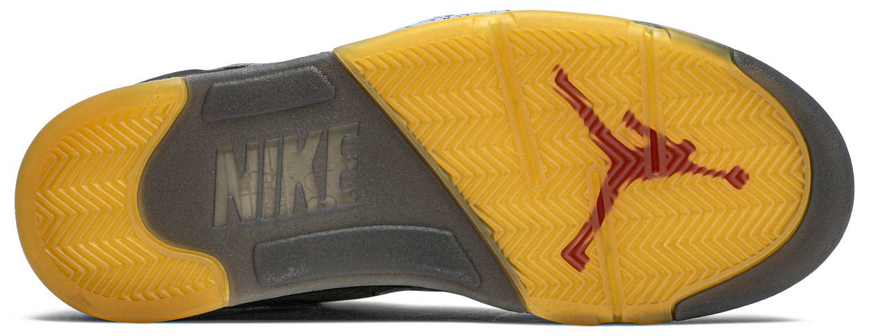 The Off-White x Air Jordan 5 SP 'Muslin' delivers Virgil Abloh’s stylized take on the retro silhouette. The faded black textile upper blends traditional details, including a silver reflective tongue and embroidered Nike Air branding, with Virgil’s signature text on the laces and medial-side quarter panel. A pre-yellowed translucent rubber outsole adds to the sneaker’s vintage aesthetic.