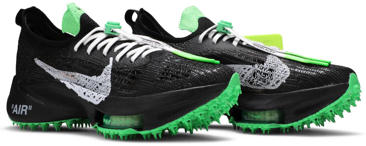 The Off-White x Nike Air Zoom Tempo Next% ‘Black’ pairs Virgil Abloh’s signature aesthetic with performance running technology. A toggle lacing system secures a black knit upper embellished with a painted white Swoosh, bright green plastic zip tie and stenciled lines of Helvetica text on the medial side. The lightweight build is mounted on a matching black foam midsole with ‘AIR’ stamped on the lateral sidewall. Additional cushioning is provided by a ZoomX foam insole and a visible Zoom Air unit under the forefoot. A green rubber-spiked outsole takes inspiration from performance racing spikes.