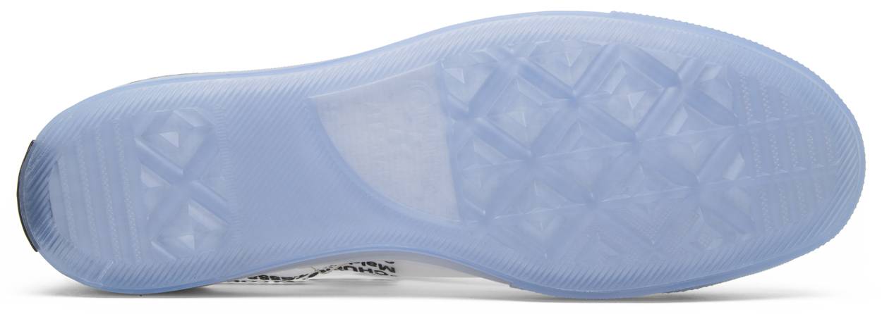 The final pair of Virgil Abloh's 'The Ten' collection, the Off-White x Chuck Taylor All-Star 70 was released in May 2017 as part of the 'GHOSTING' pack. Featuring a translucent white upper and an ice-blue gradient on the sole, the shoe features bold lettering along its silhouette: "LEFT" and "RIGHT" on the toecaps, “VULCANIZED” over the midsole, “SHOELACES” on each lace, with Off-White's stamp on each side-panel. A red zip-tie hooked through the laces completes the look.