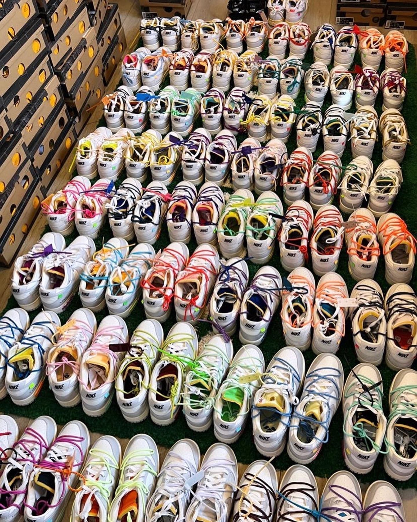 Labeled ‘01 of 50,’ this inaugural edition of the Off-White x Nike Dunk Low kicks off the ‘Dear Summer’ collection, featuring a crisp white upper built with a blend of canvas and leather. A metallic silver Swoosh cuts through the side panel, while supplemental rope laces zigzag across the upper, looping through integrated Flywire cables that emerge from strategically placed eyelets. A pre-yellowed midsole combines with an exposed foam tongue to give the shoe a vintage aesthetic. Virgil Abloh’s signature touches include a white plastic zip tie, an off-center tongue tag and lines of Helvetica text on the medial side.
