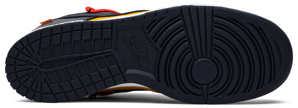 Off-White and Nike continue their creative partnership by revisiting the Dunk Low for a three-piece capsule. This edition in University Gold and navy leather sports a signature orange flag label on the lateral Swoosh. Virgil Abloh's deconstructed style is exhibited in the form of secondary Flywire lacing, exposed tongue foam and enlarged branding on the medial. The sneaker's split-colored rubber cupsole remains.