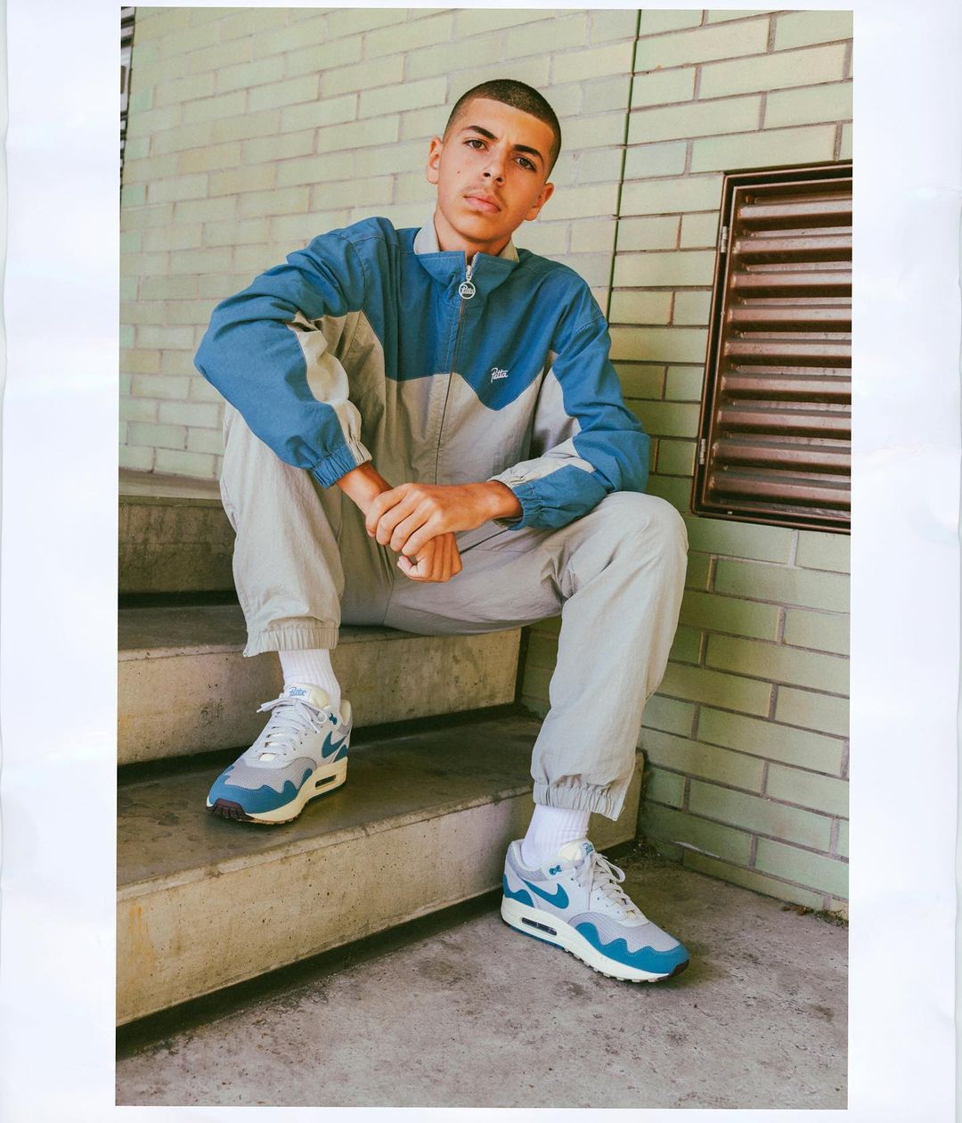 The Patta x Nike Air Max 1 ‘Noise Aqua’ reconvenes the creative partners on yet another AM1 collaboration. The shoe’s defining feature is a wavy suede mudguard, rendered in a bright blue finish with an embroidered mini-Swoosh on the lateral forefoot. The rest of the upper is crafted from matte silver mesh with white leather overlays and a blue suede Swoosh. A woven Patta tag graces the mesh tongue, while embroidered Nike Air branding adorns the back heel. Lightweight cushioning is provided by a pre-yellowed polyurethane midsole with a visible Max Air unit nestled under the heel.