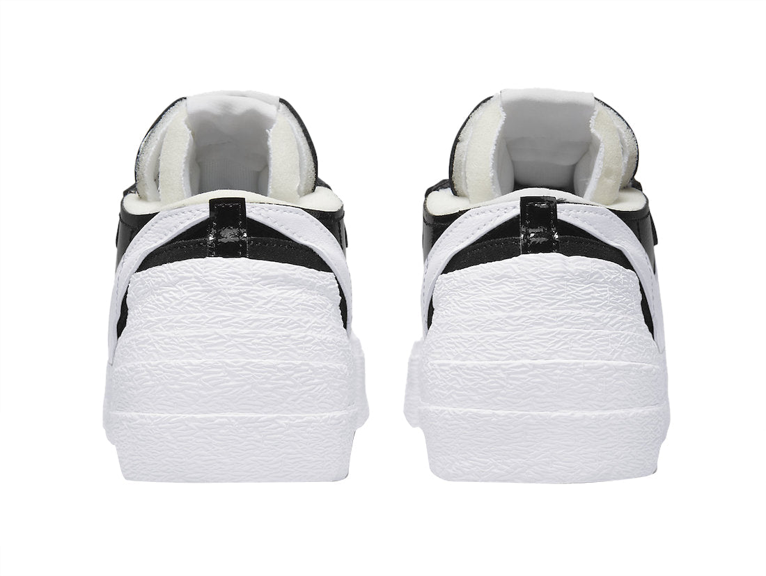 This sacai x Nike Blazer Low show that it comes dressed in a Black glossy patent leather upper complimented by the leather spotted on the tongue and eyelets. Elsewhere you will find the double Swooshes done in White leather and Black suede, while the stacked/doubled aesthetic is spotted on the laces, eyestays, and exposed foam tongues. Dual branding on the “back” tongue, co-branded insoles and a White rubber sole with overlapping layers round out the main features of the sneaker.