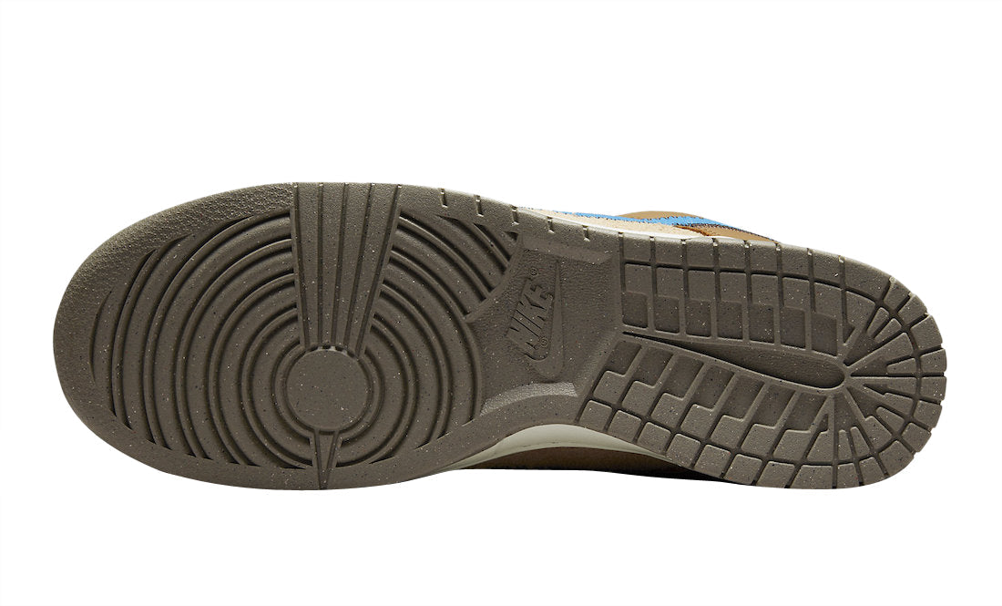 This size? x Nike Dunk Low starts off with a tan hairy suede material on the base of the upper which is joined by brown leather on the overlays. Standout details on this Nike Dunk include blue suede Swooshes on the side panels with black stitching, unique orange tongue tags, and green suede heel tabs. Brown and tan laces, white rubber midsoles, and grey rubber outsoles with subtle speckling cap off the design.