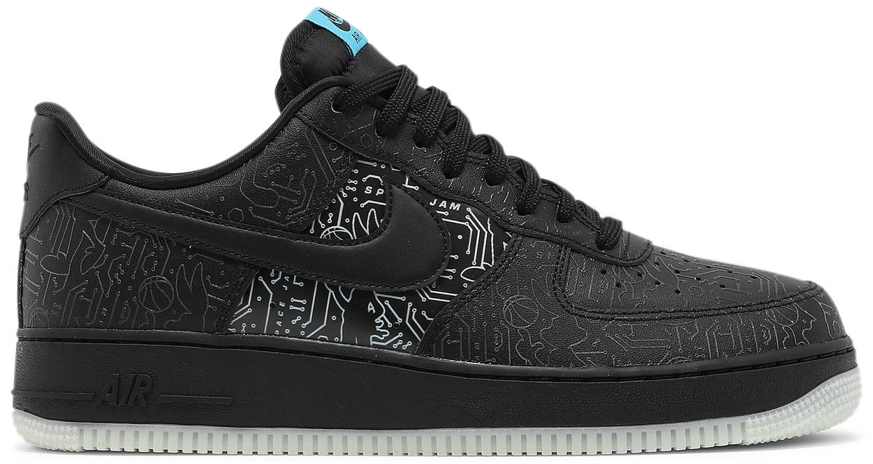 The Nike Air Force 1 ‘07 ‘Computer Chip’ is drawn from a limited collection launching in conjunction with LeBron James’ ‘Space Jam: A New Legacy,’ the standalone sequel to the original 1996 film. The vintage hoops shoe features computer chip-inspired graphics throughout the upper, crafted from black leather with matching black textile on the quarter panel. Upon closer inspection, the circuit lines coalesce into familiar forms that strongly resemble the silhouettes of Bugs Bunny and his newest Tune Squad teammate, LeBron James. The angular lines — rendered in tonal fashion except on the quarter panel, where they’re etched in blue — glow in the dark, along with the milky rubber outsole.