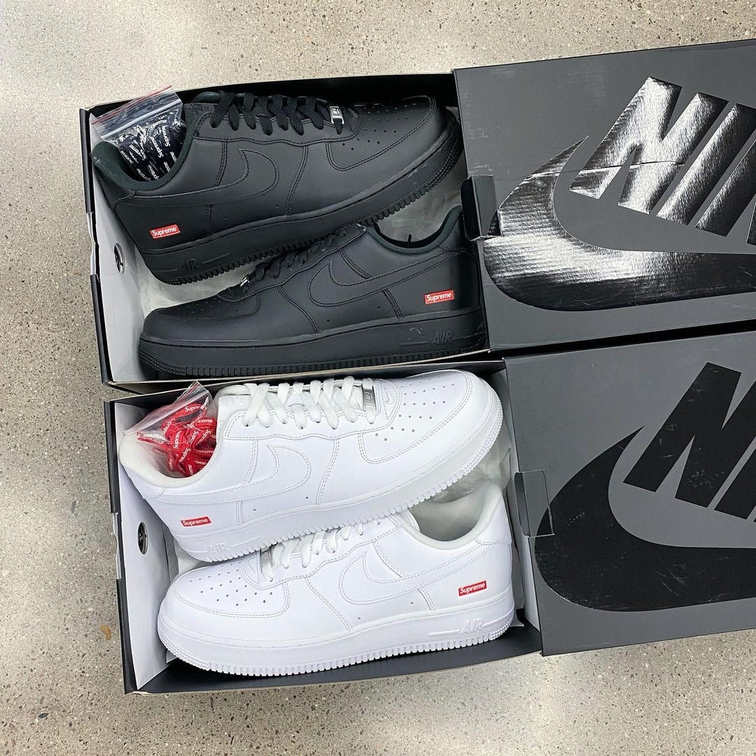 The Supreme x Air Force 1 Low ‘Box Logo’ debuted as part of the New York brand’s Spring/Summer 2020 collection, showcasing a minimalist design with restrained branding. Built with a full-grain leather upper, the retro silhouette is entirely dipped in black, save for Supreme’s signature red box logo on the lateral heel. The same detail is repeated on the custom sockliner, alongside a Nike Air logo hit. The kicks come with a second set of black laces printed with Supreme branding.