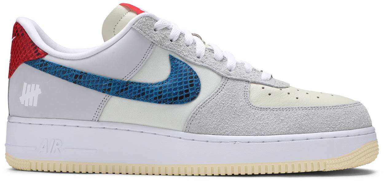 Taken from the second installment of the LA retailer’s ‘Dunk vs. AF-1’ series, the Undefeated x Nike Air Force 1 Low ‘5 On It’ takes inspiration from sneaker culture during the late ‘90s and early 2000s, a period when exotic materials reigned supreme. This pair makes use of a light grey leather upper with tonal suede overlays and blue and red snakeskin on the Swoosh and heel tab. Undefeated’s Five Strikes logo decorates the lateral heel and an orange woven tag atop the tongue. The sneaker rides on a crisp white rubber midsole and cream-colored pivot-point outsole.