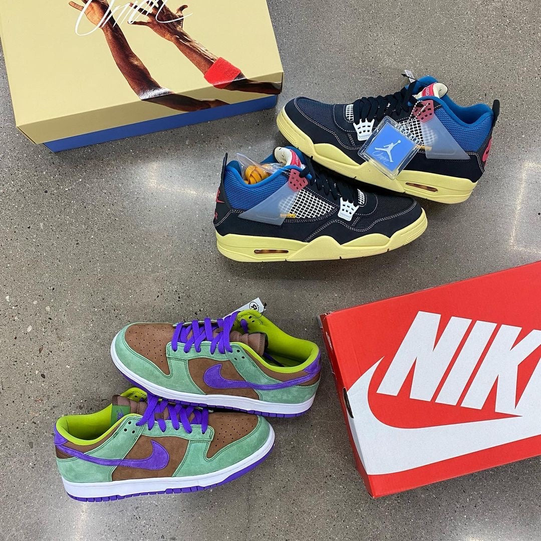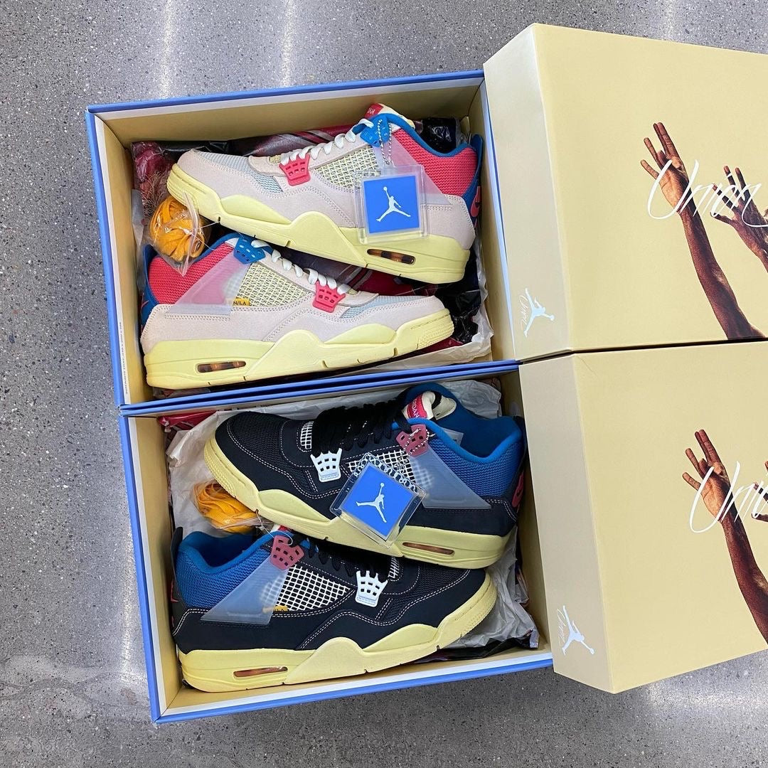 The Union LA x Air Jordan 4 Retro ‘Off Noir’ represents the follow-up effort to the duo’s highly coveted Air Jordan 1 collaboration from 2018. The updated design features a black suede upper with matching black mesh on the toe box and blue mesh around the collar. The semi-translucent structural wings are attached to molded red eyelets, matching the woven Air Jordan tag atop the padded tongue and Nike Air branding on the heel. The TPU wings are filled in, reminiscent of an original Tinker Hatfield sketch of the AJ4, while the AIR JORDAN tag usually found on the inside of the tongue conveys a unique look, like someone folded the tongue over to expose the inside tag. Finally, a 'UN/LA' tag on the side panel shows the Union heritage and a yellowed midsole conveys a vintage aesthetic.