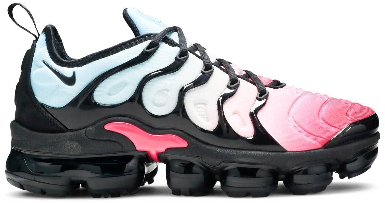 The women’s Nike Air VaporMax Plus ‘Rocket Pop’ applies a gradient blend of Hyper Pink and Glacier Ice to a mesh upper borrowed from the Air Max Plus, complete with signature TPU overlays in a glossy black finish. Matching black is utilized on the groundbreaking VaporMax platform, reinforced underfoot by durable rubber pods in high-wear areas. The sneaker’s prominent midfoot shank stands out in a final pop of fuchsia.
