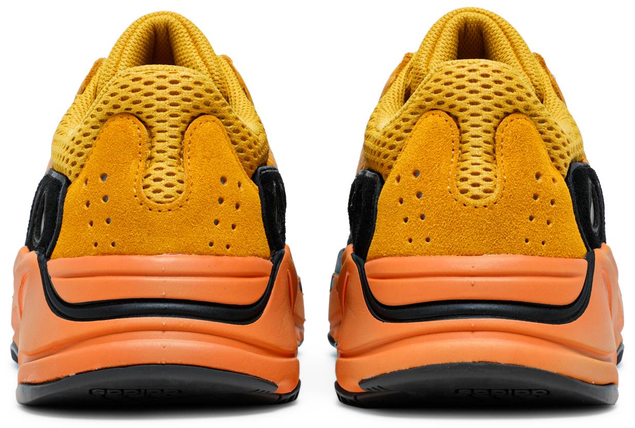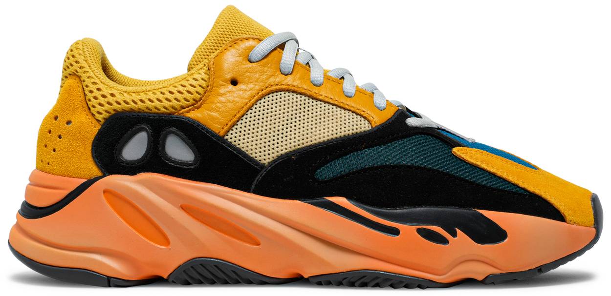 The adidas Yeezy Boost 700 ‘Sun’ treats the lifestyle runner to a lively color scheme that accentuates the silhouette’s multi-layered build. The majority of the mesh and leather upper is rendered in varying shades of yellow, contrasted by a black suede overlay that extends to mesh forefoot panels in blue and teal. A clashing coral finish is applied to the bulky midsole, featuring full-length drop-in Boost cushioning for a smooth ride. Underfoot, a herringbone rubber outsole delivers optimal grip.