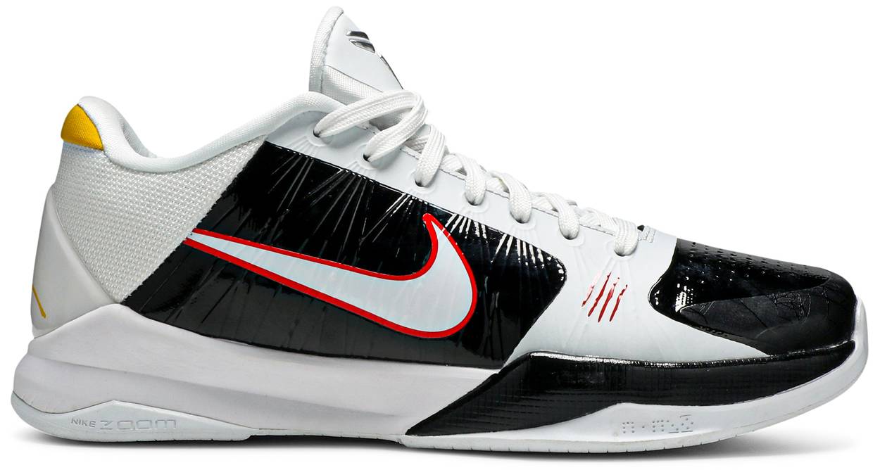 The Nike Zoom Kobe 5 Protro ‘Alternate Bruce Lee’ pays homage to the iconic martial artist with a design that takes its cues from the 2010 colorway inspired by Lee’s jumpsuit from ‘Enter the Dragon.’ The black and white color scheme adds yellow accents in a nod to the original, along with the distinctive red scratch marks on the lateral forefoot. While the original Zoom Kobe 5 featured Zoom Air cushioning in the forefoot and heel, this pair utilizes a large-volume Zoom Air unit only in the forefoot.